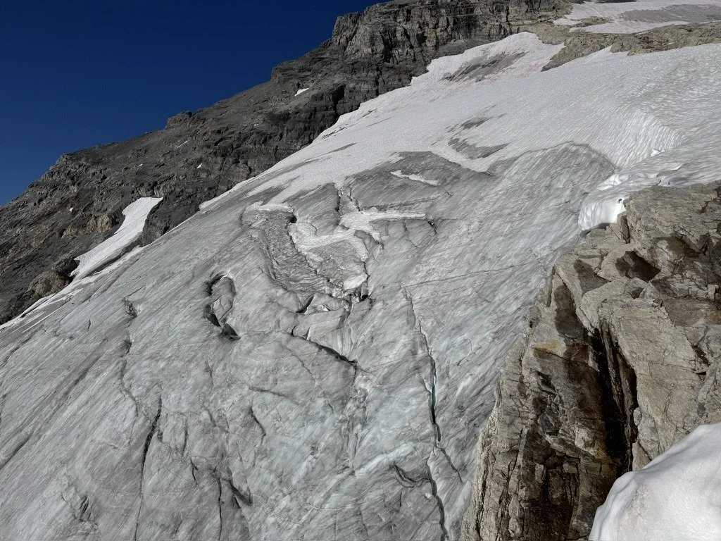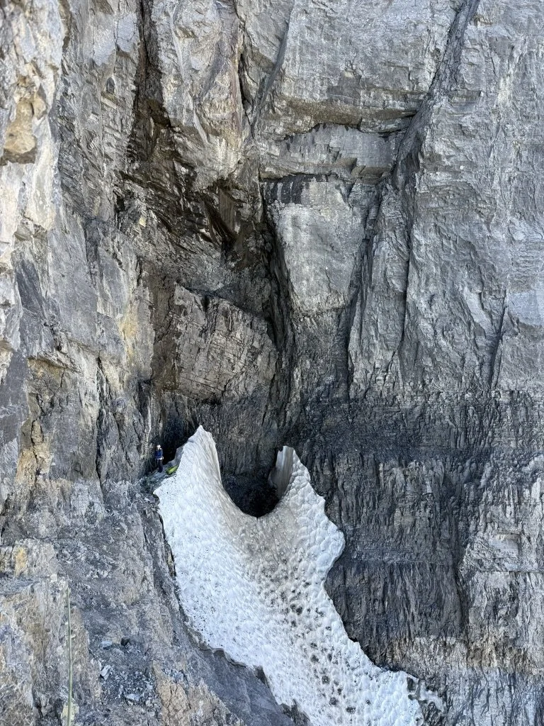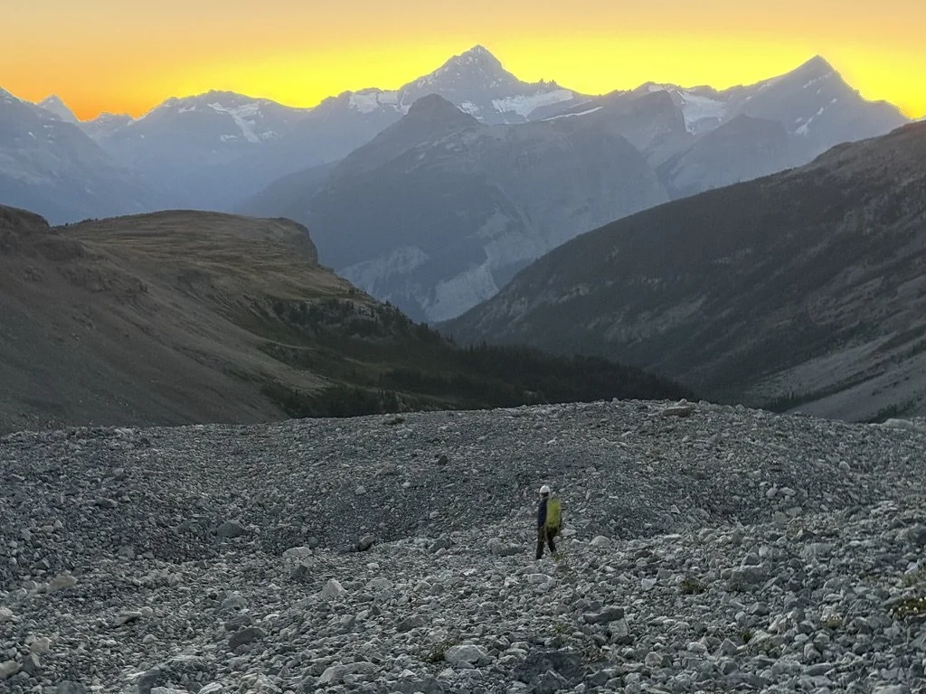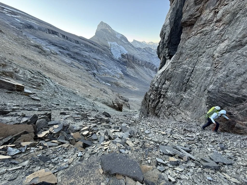 After about ~400 meters of descent via scree and some easy snow slopes where the glacier proper makes a turn north, we discovered with great sadness it would not be a casual affair after all. As is the case with many of the glaciers and icefields in the Rockies, they are rapidly melting and becoming very difficult to navigate as a result. Some proper troubleshooting had us traverse into a prow of rock paralleling the glacier, where we were able to set up a few rappels that had us bypass the steepest and most broken parts of the ice. Unfortunately this too took a good chunk of time to sort out, which meant that if we wanted to finish the journey back too, we’d be pulling a very late night.