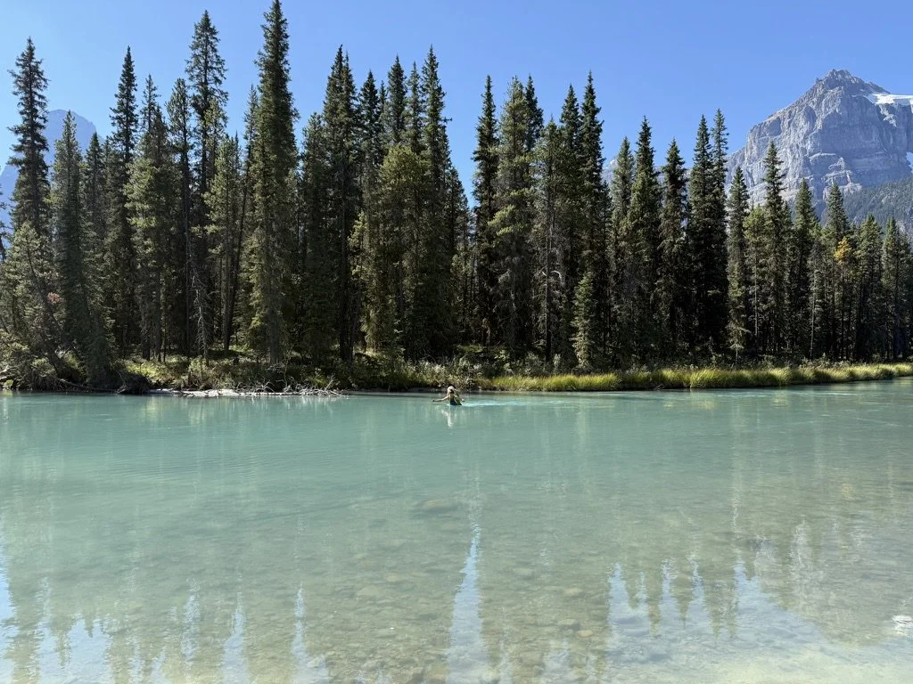 A few years ago I had made a short-lived attempt on Howse’s N.E. Buttress with my good friend, but we bailed about ~250 meters up the route, realizing that our somewhat casual alpine start wasn’t going to cut it for an in-a-day ascent. We drove out to Howse late Friday afternoon after trying to both wrap up our work tasks for the week. Our first obstacle to assess was the Mistaya River crossing, which we heard could be quite deep. Fortunately, it didn’t appear to be unfordable — potentially deep but slow moving.